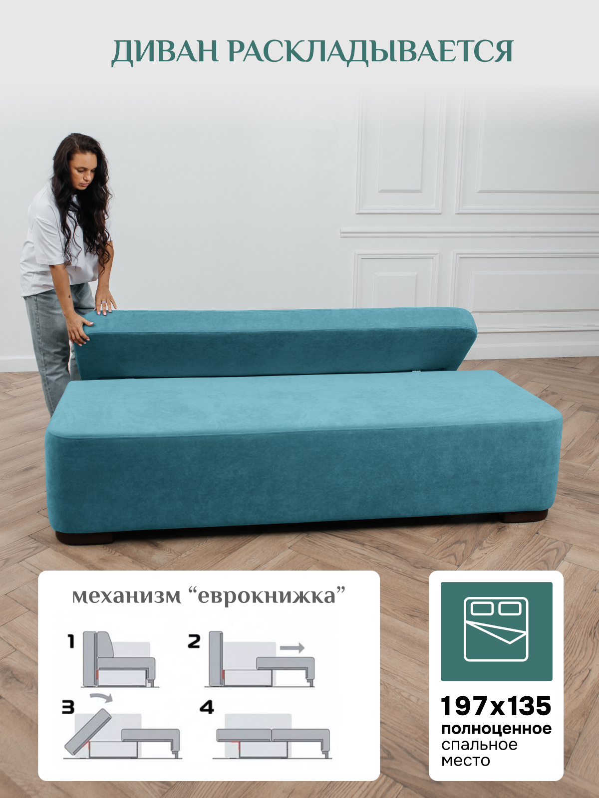 Спальное место формируется на основе механизма трансформации "Еврокнижка". Преимущества трансформации диванов Еврокнижка: Прочность. Механизм редко ломается и устроен максимально просто: сиденье нужно потянуть вперед, а на его место поставить спинку.